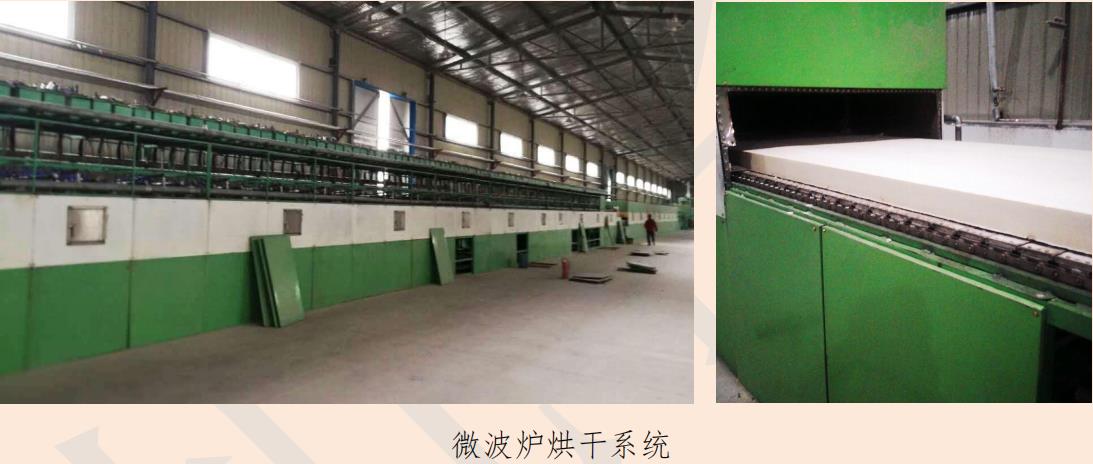 (纖維紙/板)采用噴吹型或(纖維板)甩絲型纖維棉作為生產(chǎn)陶瓷纖維濕法板/紙的原 料,纖維棉先經(jīng)過粉碎、除渣、碎漿、清洗處理,達(dá)到纖維板生產(chǎn)工藝的要求,分散于漿池 中的纖維無團(tuán)狀纖維。在碎漿的過程中,各環(huán)節(jié)根據(jù)程序自動加入所需要的膠黏劑、填料和 添加劑并使其攪拌混合均勻;然后輸送到儲漿罐,供成型機成型使用。配漿完畢的漿料用泵 送入成型機,利用成型機腔體的真空負(fù)壓,使纖維漿料吸附于成型機上形成濕胚,同時進(jìn)行 真空脫水,脫水后的成型棉胚通過網(wǎng)布輸送到壓光機,經(jīng)過擠壓、撫平,然后輸送到烘干爐 內(nèi)進(jìn)行烘干。 烘干爐采用微波復(fù)合式干燥裝置,用以實現(xiàn)制品的干燥及定形;經(jīng)過烘干定型后的產(chǎn)品 通過輸送帶輸送到配有測長儀的縱橫切割機進(jìn)行定尺切割,最后質(zhì)量檢驗和包裝,成品送進(jìn) 倉庫,以備發(fā)貨。